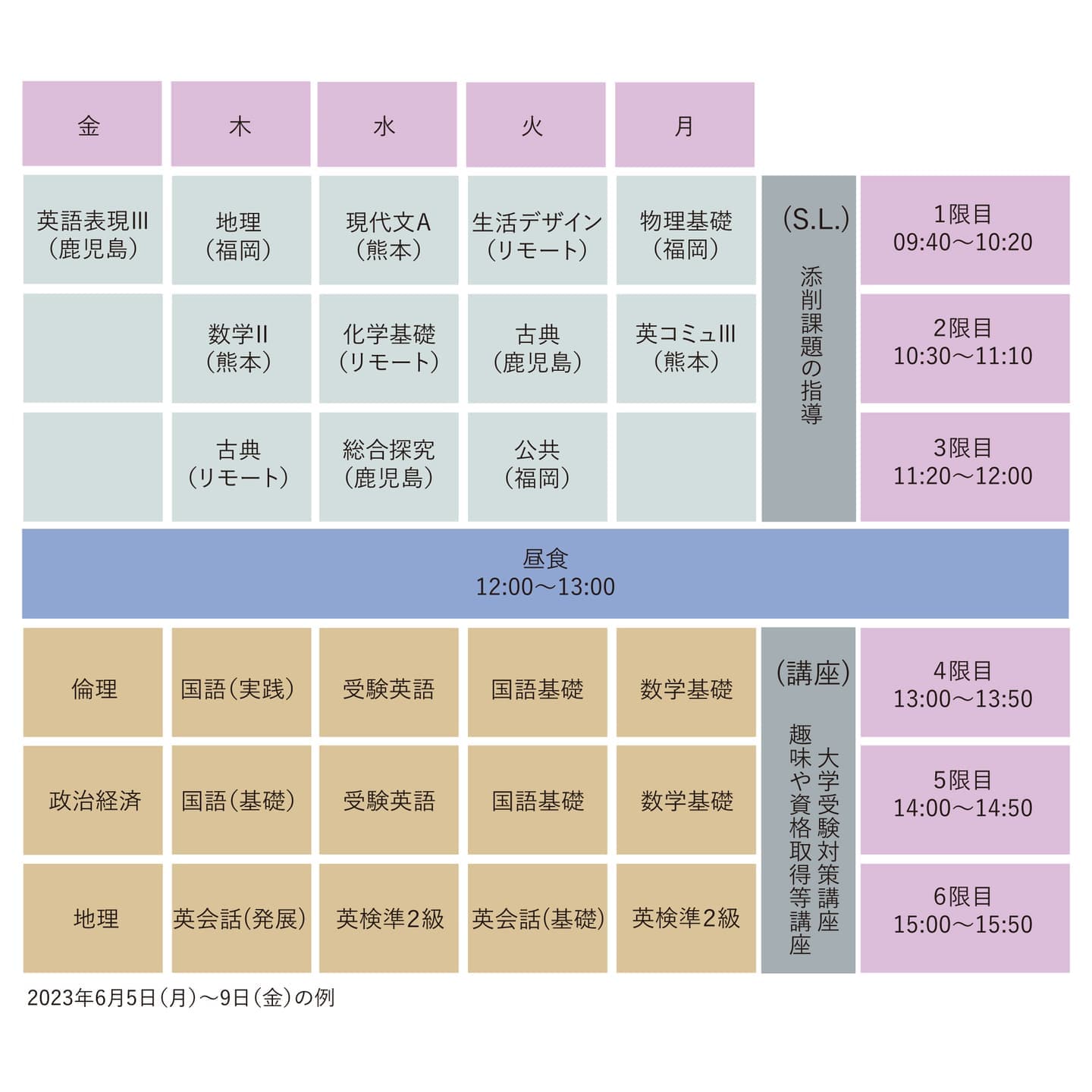そよ風学舎の授業は対面授業とリモート授業のハイブリッドです。下の時間割をご覧ください。月曜日1限目の物理基礎の授業は福岡で行います。福岡では対面ですが、熊本、鹿児島では配信による授業となります。もちろん、配信でも先生との対話や質問等もリアルタイムでできます。2限目は英語の授業です。熊本の生徒は対面による授業、福岡、鹿児島の生徒はリモートによる授業です。